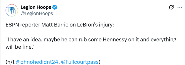 40岁的詹姆斯已缺席湖人队前两场季前赛,且尚未参加一次完整的训练。湖人队主教练雷迪克此前将其伤情描述为“臀部神经刺激”。ESPN记者Matt Barrie在报道时调侃了老詹: “我倒有个主意,或许他往伤处抹点轩尼诗,一切就都好了。”此前,詹姆斯以“决定2”的方式宣布与轩尼诗推出联名干邑,遭到不少嘲讽。