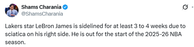 尽管湖人队在整个季前赛期间对这位老将球星一直持谨慎态度,但球队原本期望且希望他能做好准备,参加10月22日对阵金州勇士队的新赛季揭幕战。遗憾的是,詹姆斯不仅会错过球队所有季前热身赛,他新赛季的首秀最早也要等到11月初。