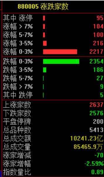 市场共2637只个股上涨,95只个股涨停,2576只个股下跌。